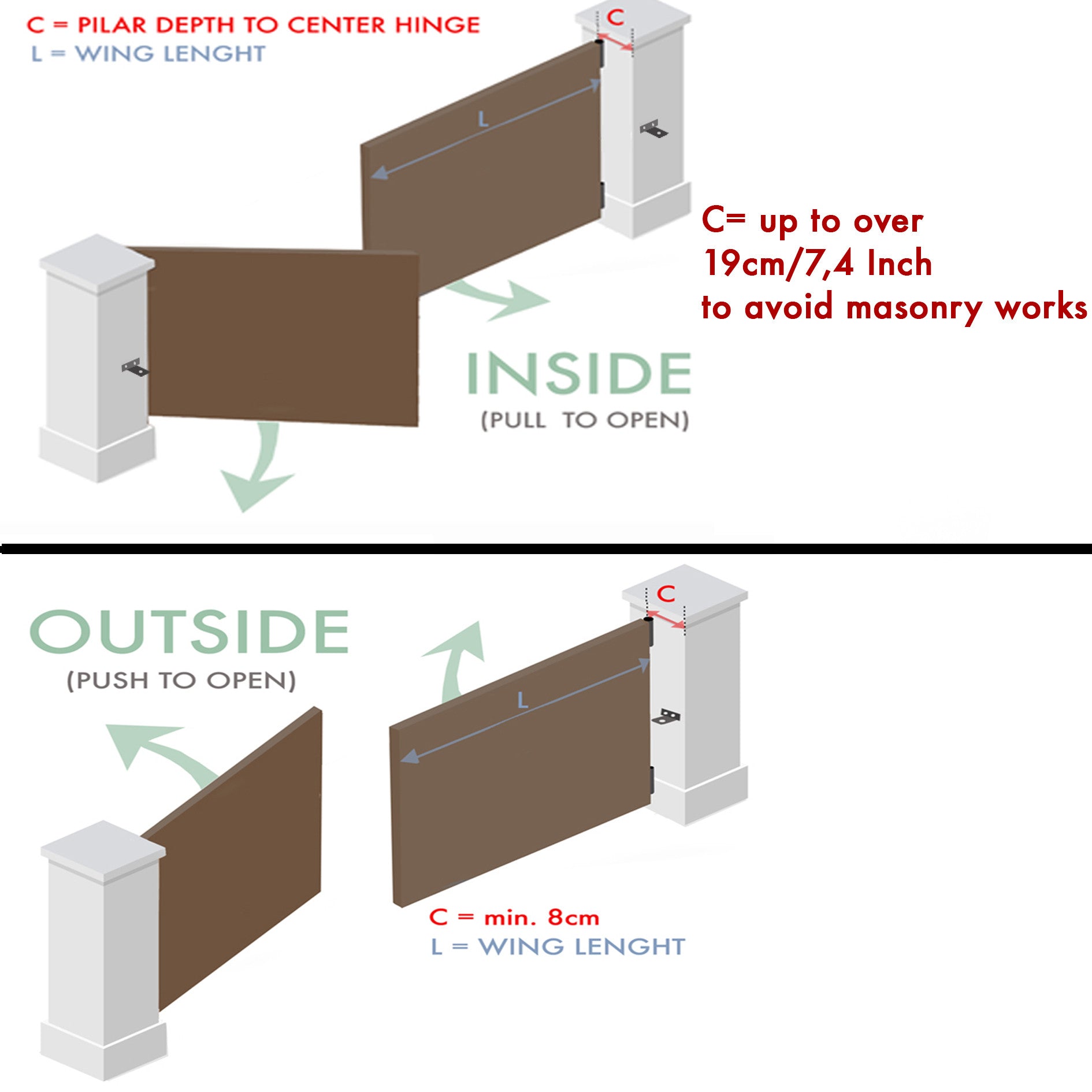 - Pair of stand-alone columns: one column is 120cm H with integrated key switch and infrared safety sensor (photocells). Second column is 75cm H with integrated infrared safety sensor version